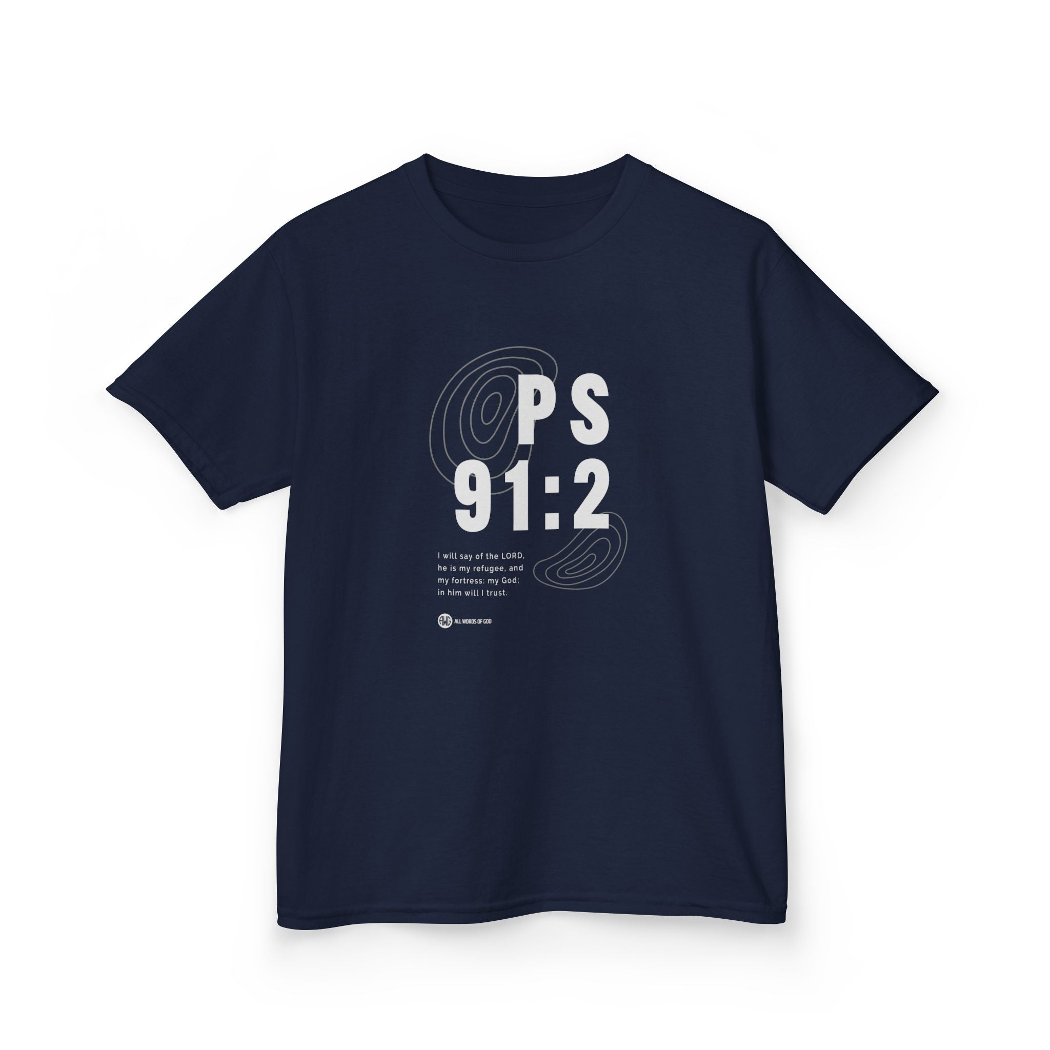 Soft, midweight kids’ tee with a minimalist, modern hymn-inspired design. The black cotton shirt wears a bold white print centered on the chest: “PS 91:2” layered over subtle concentric linework and a small line of text beneath that echoes faith and protection. Lightweight but durable, the tee moves easily from weekday play to quiet family gatherings. It’s built for layering under jackets or for letting the graphic stand out on its own. The overall feel is calm, confident, and quietly reverent — made to be worn by little ones who are part of faith-centered families and communities.